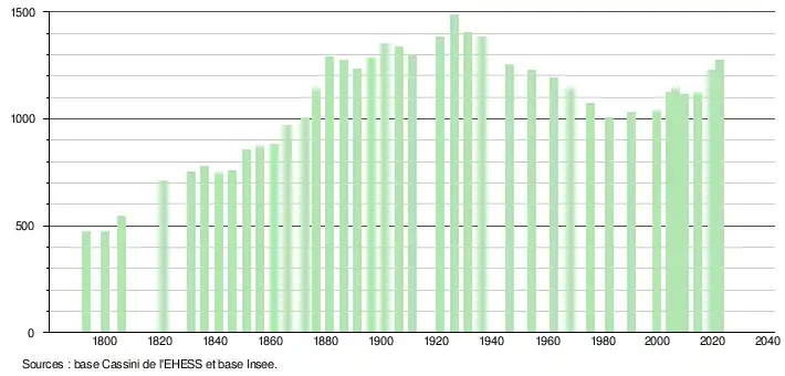 | L'évolution du nombre d'habitants est connue à travers les recensements de la population effectués dans la commune depuis 1793. Pour les communes de moins de 10 000 habitants, une enquête de recensement portant sur toute la population est réalisée tous les cinq ans, les populations de référence des années intermédiaires étant quant à elles estimées par interpolation ou extrapolation[37]. Pour la commune, le premier recensement exhaustif entrant dans le cadre du nouveau dispositif a été réalisé en 2004[38]. En 2022, la commune comptait 1 275 habitants[Note 4], en évolution de +13,13 % par rapport à 2016 (Aude : +2,65 %, France hors Mayotte : +2,11 %). |