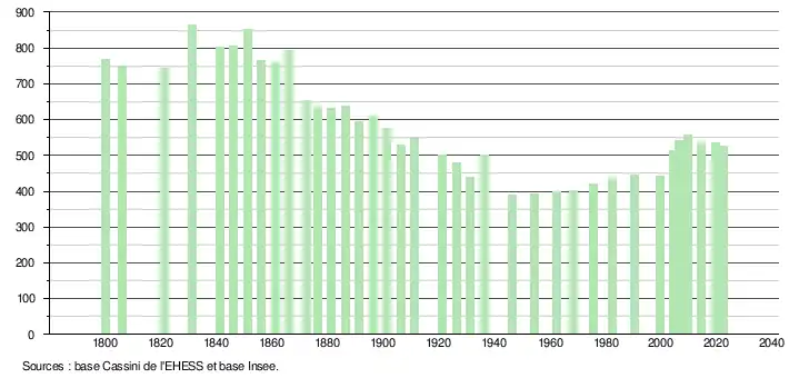 L'évolution du nombre d'habitants est connue à travers les recensements de la population effectués dans la commune depuis 1800. Pour les communes de moins de 10 000 habitants, une enquête de recensement portant sur toute la population est réalisée tous les cinq ans, les populations de référence des années intermédiaires étant quant à elles estimées par interpolation ou extrapolation[37]. Pour la commune, le premier recensement exhaustif entrant dans le cadre du nouveau dispositif a été réalisé en 2004[38].