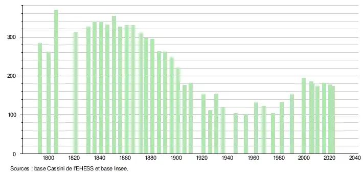 L'évolution du nombre d'habitants est connue à travers les recensements de la population effectués dans la commune depuis 1793. Pour les communes de moins de 10 000 habitants, une enquête de recensement portant sur toute la population est réalisée tous les cinq ans, les populations de référence des années intermédiaires étant quant à elles estimées par interpolation ou extrapolation[24]. Pour la commune, le premier recensement exhaustif entrant dans le cadre du nouveau dispositif a été réalisé en 2005[25].