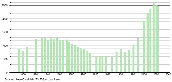 L'évolution du nombre d'habitants est connue à travers les recensements de la population effectués dans la commune depuis 1793. Pour les communes de moins de 10 000 habitants, une enquête de recensement portant sur toute la population est réalisée tous les cinq ans, les populations de référence des années intermédiaires étant quant à elles estimées par interpolation ou extrapolation[16]. Pour la commune, le premier recensement exhaustif entrant dans le cadre du nouveau dispositif a été réalisé en 2005[17].