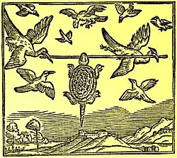 La Tortue et les oiseaux est une ancienne fable populaire, dont on peut trouver les premières versions en Inde et en Grèce. Il en existe également des variantes africaines. Les morales à en tirer sont variables et dépendent du contexte dans lequel elles sont racontées.