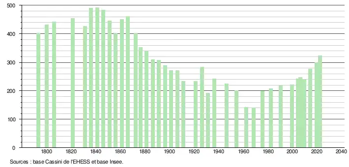 L'évolution du nombre d'habitants est connue à travers les recensements de la population effectués dans la commune depuis 1793. Pour les communes de moins de 10 000 habitants, une enquête de recensement portant sur toute la population est réalisée tous les cinq ans, les populations de référence des années intermédiaires étant quant à elles estimées par interpolation ou extrapolation[16]. Pour la commune, le premier recensement exhaustif entrant dans le cadre du nouveau dispositif a été réalisé en 2004[17].