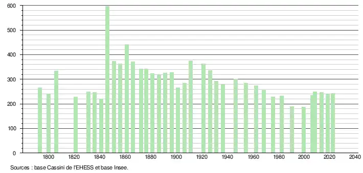 L'évolution du nombre d'habitants est connue à travers les recensements de la population effectués dans la commune depuis 1793. Pour les communes de moins de 10 000 habitants, une enquête de recensement portant sur toute la population est réalisée tous les cinq ans, les populations de référence des années intermédiaires étant quant à elles estimées par interpolation ou extrapolation[27]. Pour la commune, le premier recensement exhaustif entrant dans le cadre du nouveau dispositif a été réalisé en 2008[28].