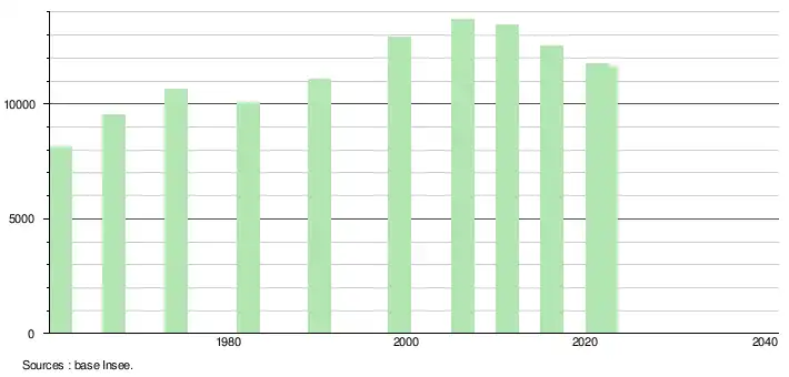 - ↑ Par convention dans Wikipédia, le principe a été retenu de n’afficher dans le tableau des recensements et le graphique, pour les populations de référence postérieures à 1999, que les populations correspondant à une enquête exhaustive de recensement pour les communes de moins de 10 000 habitants, et que les populations des années 2006, 2011, 2016, etc. pour les communes de plus de 10 000 habitants, ainsi que la dernière population de référence publiée par l’Insee pour l'ensemble des communes.