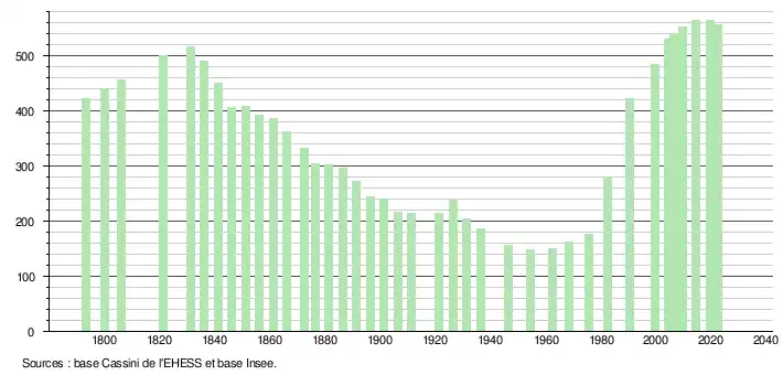 L'évolution du nombre d'habitants est connue à travers les recensements de la population effectués dans la commune depuis 1793. Pour les communes de moins de 10 000 habitants, une enquête de recensement portant sur toute la population est réalisée tous les cinq ans, les populations de référence des années intermédiaires étant quant à elles estimées par interpolation ou extrapolation[21]. Pour la commune, le premier recensement exhaustif entrant dans le cadre du nouveau dispositif a été réalisé en 2004[22].