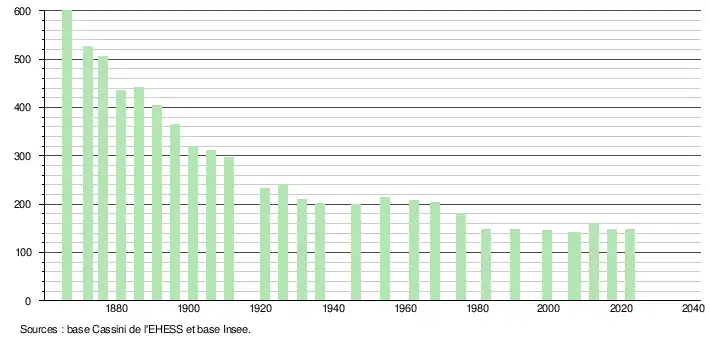 L'évolution du nombre d'habitants est connue à travers les recensements de la population effectués dans la commune depuis 1866. Pour les communes de moins de 10 000 habitants, une enquête de recensement portant sur toute la population est réalisée tous les cinq ans, les populations de référence des années intermédiaires étant quant à elles estimées par interpolation ou extrapolation[19]. Pour la commune, le premier recensement exhaustif entrant dans le cadre du nouveau dispositif a été réalisé en 2007[20].