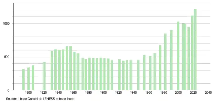 L'évolution du nombre d'habitants est connue à travers les recensements de la population effectués dans la commune depuis 1793. Pour les communes de moins de 10 000 habitants, une enquête de recensement portant sur toute la population est réalisée tous les cinq ans, les populations de référence des années intermédiaires étant quant à elles estimées par interpolation ou extrapolation[27]. Pour la commune, le premier recensement exhaustif entrant dans le cadre du nouveau dispositif a été réalisé en 2008[28].