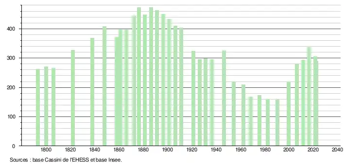 L'évolution du nombre d'habitants est connue à travers les recensements de la population effectués dans la commune depuis 1793. Pour les communes de moins de 10 000 habitants, une enquête de recensement portant sur toute la population est réalisée tous les cinq ans, les populations de référence des années intermédiaires étant quant à elles estimées par interpolation ou extrapolation[17]. Pour la commune, le premier recensement exhaustif entrant dans le cadre du nouveau dispositif a été réalisé en 2006[18].