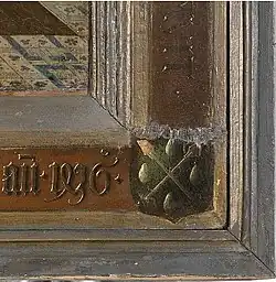Le panneau est composé de six planches de bois horizontales. L'envers n'est pas peint, ce qui laisse supposer que le tableau devait être accroché contre un mur[29]. Le cadre original a été conservé. Il s'agit d'un cadre richement ornementé : les armoiries paternelles et maternelles du donateur sont peintes dans chaque coin, la signature de Van Eyck figure dans la partie inférieure et des commentaires sur les saints ornent les côtés[30]. Les inscriptions sont peintes d'une manière illusionnistes, celles de la partie inférieure semblant en relief sur laiton et celles des autres côtés paraissant gravées en creux[20].