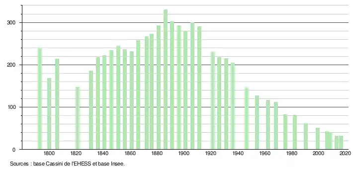 L'évolution du nombre d'habitants est connue à travers les recensements de la population effectués dans la commune depuis 1793. Pour les communes de moins de 10 000 habitants, une enquête de recensement portant sur toute la population est réalisée tous les cinq ans, les populations de référence des années intermédiaires étant quant à elles estimées par interpolation ou extrapolation[3]. Pour la commune, le premier recensement exhaustif entrant dans le cadre du nouveau dispositif a été réalisé en 2008[4].