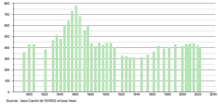 L'évolution du nombre d'habitants est connue à travers les recensements de la population effectués dans la commune depuis 1793. Pour les communes de moins de 10 000 habitants, une enquête de recensement portant sur toute la population est réalisée tous les cinq ans, les populations de référence des années intermédiaires étant quant à elles estimées par interpolation ou extrapolation[23]. Pour la commune, le premier recensement exhaustif entrant dans le cadre du nouveau dispositif a été réalisé en 2004[24].