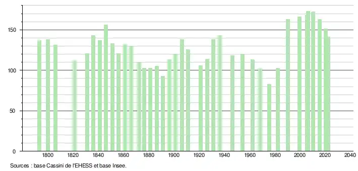 L'évolution du nombre d'habitants est connue à travers les recensements de la population effectués dans la commune depuis 1793. Pour les communes de moins de 10 000 habitants, une enquête de recensement portant sur toute la population est réalisée tous les cinq ans, les populations de référence des années intermédiaires étant quant à elles estimées par interpolation ou extrapolation[18]. Pour la commune, le premier recensement exhaustif entrant dans le cadre du nouveau dispositif a été réalisé en 2005[19].
