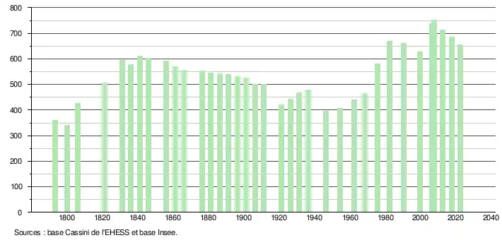 L'évolution du nombre d'habitants est connue à travers les recensements de la population effectués dans la commune depuis 1793. Pour les communes de moins de 10 000 habitants, une enquête de recensement portant sur toute la population est réalisée tous les cinq ans, les populations de référence des années intermédiaires étant quant à elles estimées par interpolation ou extrapolation[32]. Pour la commune, le premier recensement exhaustif entrant dans le cadre du nouveau dispositif a été réalisé en 2007[33].
