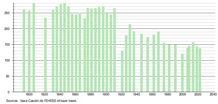 L'évolution du nombre d'habitants est connue à travers les recensements de la population effectués dans la commune depuis 1793. Pour les communes de moins de 10 000 habitants, une enquête de recensement portant sur toute la population est réalisée tous les cinq ans, les populations de référence des années intermédiaires étant quant à elles estimées par interpolation ou extrapolation[23]. Pour la commune, le premier recensement exhaustif entrant dans le cadre du nouveau dispositif a été réalisé en 2008[24].