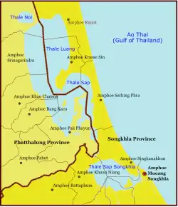 Le lac est formé de trois parties. Le sud s'ouvre par un détroit de 380 m de large sur le golfe de Thaïlande au niveau de la ville de Songkhla et contient des eaux saumâtres dont la salinité est d'environ la moitié celle de l'océan. Plus au nord, au-dessus d'un rétrécissement de km, se trouve le Thale Luang (litt. "mer principale") (782,80 km2) et tout au nord, au-delà d'une mangrove, le Thale Noi (thaï : ทะเลน้อย ; litt. « petite mer ») de 28 km2, entièrement dans la province de Phattalung. La caractéristique la plus remarquable du lac est le cordon littoral de 75 km de long qui le sépare de la mer. Contrairement à la plupart des cordons littoraux, il a probablement été formé par l'union d'îles existantes, reliées par la sédimentation du précurseur du lac.