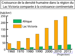 Ses pourtours densément peuplés (246 hab./km2)[10] contrastent avec les vides humains qui, en ce qui concerne la région du lac Victoria, correspondent à l'Ouest au bassin congolais et à l'Est au plateau steppique de l'Afrique orientale[11].