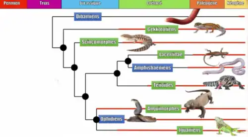- ↑ (en) Yuchi Zheng et John J. Wiens, « Combining phylogenomic and supermatrix approaches, and a time-calibrated phylogeny for squamate reptiles (lizards and snakes) based on 52 genes and 4162 species », Molecular Phylogenetics and Evolution, vol. 94, , p. 537–547 (DOI 10.1016/j.ympev.2015.10.009, lire en ligne)Arbre en ligne sur le site RDB