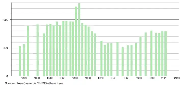 L'évolution du nombre d'habitants est connue à travers les recensements de la population effectués dans la commune depuis 1793. Pour les communes de moins de 10 000 habitants, une enquête de recensement portant sur toute la population est réalisée tous les cinq ans, les populations de référence des années intermédiaires étant quant à elles estimées par interpolation ou extrapolation[35]. Pour la commune, le premier recensement exhaustif entrant dans le cadre du nouveau dispositif a été réalisé en 2006[36].