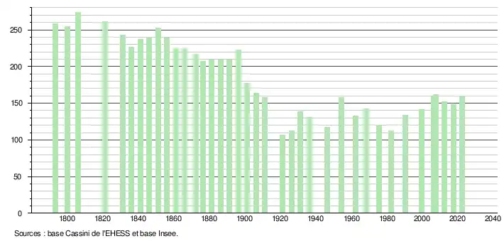 L'évolution du nombre d'habitants est connue à travers les recensements de la population effectués dans la commune depuis 1793. Pour les communes de moins de 10 000 habitants, une enquête de recensement portant sur toute la population est réalisée tous les cinq ans, les populations de référence des années intermédiaires étant quant à elles estimées par interpolation ou extrapolation[29]. Pour la commune, le premier recensement exhaustif entrant dans le cadre du nouveau dispositif a été réalisé en 2007[30].