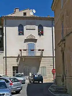 - ↑ Armorial des communes du Vaucluse. La tour est une partie de armes des Simiane (D'or semé de tours et de fleurs de lys d'azur), l'étoile celle des Sade (De gueules à l'étoile à huit rais d'or.