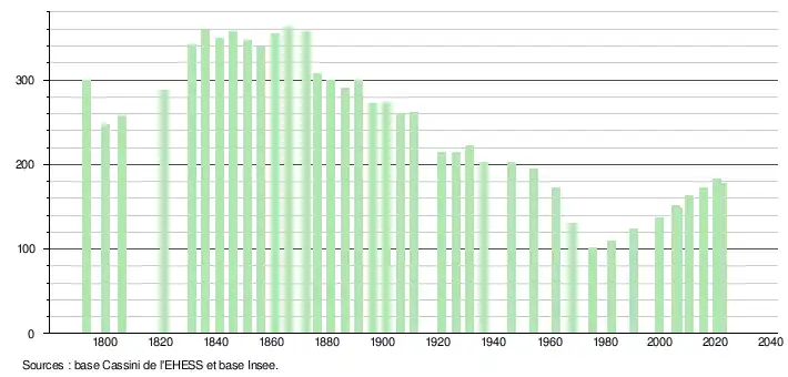 L'évolution du nombre d'habitants est connue à travers les recensements de la population effectués dans la commune depuis 1793. Pour les communes de moins de 10 000 habitants, une enquête de recensement portant sur toute la population est réalisée tous les cinq ans, les populations de référence des années intermédiaires étant quant à elles estimées par interpolation ou extrapolation[28]. Pour la commune, le premier recensement exhaustif entrant dans le cadre du nouveau dispositif a été réalisé en 2005[29].
