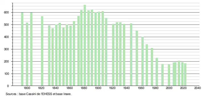 L'évolution du nombre d'habitants est connue à travers les recensements de la population effectués dans la commune depuis 1793. Pour les communes de moins de 10 000 habitants, une enquête de recensement portant sur toute la population est réalisée tous les cinq ans, les populations de référence des années intermédiaires étant quant à elles estimées par interpolation ou extrapolation[19]. Pour la commune, le premier recensement exhaustif entrant dans le cadre du nouveau dispositif a été réalisé en 2008[20].
