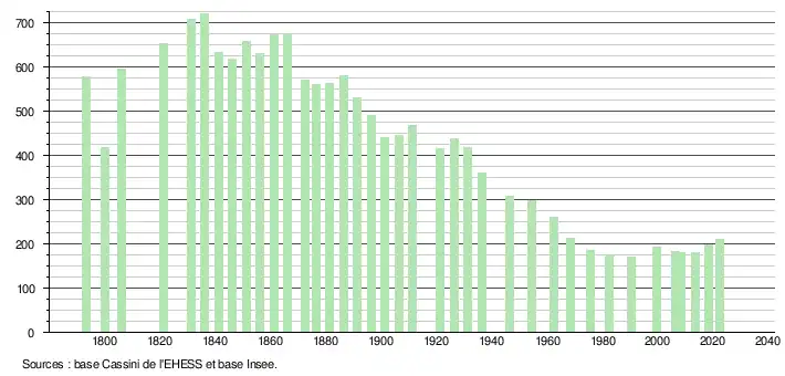 - ↑ Population municipale de référence en vigueur au 1er janvier 2025, millésimée 2022, définie dans les limites territoriales en vigueur au 1er janvier 2024, date de référence statistique : 1er janvier 2022.