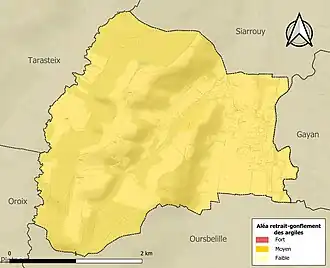 Le retrait-gonflement des sols argileux est susceptible d'engendrer des dommages importants aux bâtiments en cas d’alternance de périodes de sécheresse et de pluie. La totalité de la commune est en aléa moyen ou fort (44,5 % au niveau départemental et 48,5 % au niveau national). Sur les 215 bâtiments dénombrés sur la commune en 2019, 215 sont en aléa moyen ou fort, soit 100 %, à comparer aux 75 % au niveau départemental et 54 % au niveau national. Une cartographie de l'exposition du territoire national au retrait gonflement des sols argileux est disponible sur le site du BRGM[22],[Carte 3].