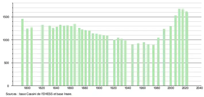 | L'évolution du nombre d'habitants est connue à travers les recensements de la population effectués dans la commune depuis 1793. Pour les communes de moins de 10 000 habitants, une enquête de recensement portant sur toute la population est réalisée tous les cinq ans, les populations de référence des années intermédiaires étant quant à elles estimées par interpolation ou extrapolation[26]. Pour la commune, le premier recensement exhaustif entrant dans le cadre du nouveau dispositif a été réalisé en 2006[27]. En 2022, la commune comptait 1 591 habitants[Note 3], en évolution de −4,67 % par rapport à 2016 (Gironde : +6,91 %, France hors Mayotte : +2,11 %). |