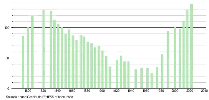 L'évolution du nombre d'habitants est connue à travers les recensements de la population effectués dans la commune depuis 1793. Pour les communes de moins de 10 000 habitants, une enquête de recensement portant sur toute la population est réalisée tous les cinq ans, les populations de référence des années intermédiaires étant quant à elles estimées par interpolation ou extrapolation[13]. Pour la commune, le premier recensement exhaustif entrant dans le cadre du nouveau dispositif a été réalisé en 2006[14].