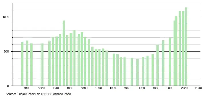 L'évolution du nombre d'habitants est connue à travers les recensements de la population effectués dans la commune depuis 1793. Pour les communes de moins de 10 000 habitants, une enquête de recensement portant sur toute la population est réalisée tous les cinq ans, les populations de référence des années intermédiaires étant quant à elles estimées par interpolation ou extrapolation[15]. Pour la commune, le premier recensement exhaustif entrant dans le cadre du nouveau dispositif a été réalisé en 2008[16].