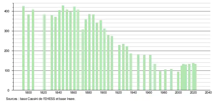 L'évolution du nombre d'habitants est connue à travers les recensements de la population effectués dans la commune depuis 1793. Pour les communes de moins de 10 000 habitants, une enquête de recensement portant sur toute la population est réalisée tous les cinq ans, les populations de référence des années intermédiaires étant quant à elles estimées par interpolation ou extrapolation[13]. Pour la commune, le premier recensement exhaustif entrant dans le cadre du nouveau dispositif a été réalisé en 2004[14].