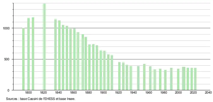 L'évolution du nombre d'habitants est connue à travers les recensements de la population effectués dans la commune depuis 1793. Pour les communes de moins de 10 000 habitants, une enquête de recensement portant sur toute la population est réalisée tous les cinq ans, les populations de référence des années intermédiaires étant quant à elles estimées par interpolation ou extrapolation[25]. Pour la commune, le premier recensement exhaustif entrant dans le cadre du nouveau dispositif a été réalisé en 2007[26].