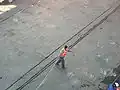 L'homme d'équipage lance la touline Le lamaneur attrape la touline Le lamaneur embraque l'aussière et la capèle