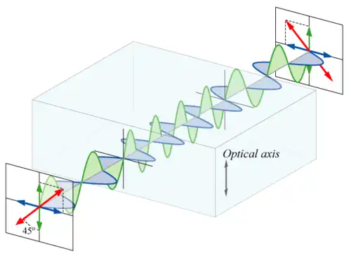 Cet effet vient de la biréfringence du cristal dans lequel est faite la lame (souvent du quartz ou du spath d'Islande) dont la forme est celle d'une lame à faces parallèles[1]. En effet, un matériau biréfringent présente un axe privilégié appelé axe optique (c'est ainsi un matériau dit anisotrope). Or la polarisation de la lumière peut être décomposée en deux composantes : chaque composante ne se propage pas à la même vitesse selon qu'elle est parallèle ou perpendiculaire à l'axe optique (voir schéma ci-contre). Ceci permet de définir deux axes particuliers de la lame : l'axe lent et l'axe rapide.