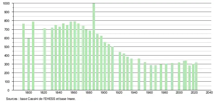 L'évolution du nombre d'habitants est connue à travers les recensements de la population effectués dans la commune depuis 1793. Pour les communes de moins de 10 000 habitants, une enquête de recensement portant sur toute la population est réalisée tous les cinq ans, les populations de référence des années intermédiaires étant quant à elles estimées par interpolation ou extrapolation[27]. Pour la commune, le premier recensement exhaustif entrant dans le cadre du nouveau dispositif a été réalisé en 2008[28].