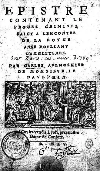 - Epistre contenant le procès criminel faict à l'encontre de la royne Anne Boullant [Boleyn] d'Angleterre, par Carles, ausmonier de M. le Dauphin. - Lyon, 1545. 8°, 47 p. Numérisé sur [François II (roi de France) Gallica].