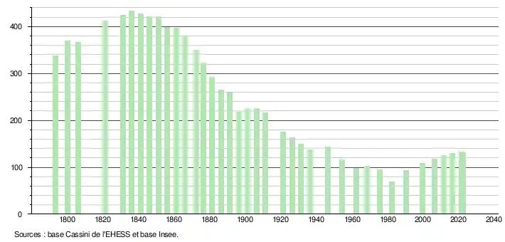 L'évolution du nombre d'habitants est connue à travers les recensements de la population effectués dans la commune depuis 1793. Pour les communes de moins de 10 000 habitants, une enquête de recensement portant sur toute la population est réalisée tous les cinq ans, les populations de référence des années intermédiaires étant quant à elles estimées par interpolation ou extrapolation[28]. Pour la commune, le premier recensement exhaustif entrant dans le cadre du nouveau dispositif a été réalisé en 2006[29].