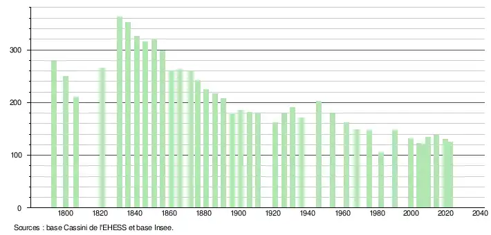L'évolution du nombre d'habitants est connue à travers les recensements de la population effectués dans la commune depuis 1793. Pour les communes de moins de 10 000 habitants, une enquête de recensement portant sur toute la population est réalisée tous les cinq ans, les populations de référence des années intermédiaires étant quant à elles estimées par interpolation ou extrapolation[26]. Pour la commune, le premier recensement exhaustif entrant dans le cadre du nouveau dispositif a été réalisé en 2004[27].