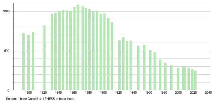 L'évolution du nombre d'habitants est connue à travers les recensements de la population effectués dans la commune depuis 1793. Pour les communes de moins de 10 000 habitants, une enquête de recensement portant sur toute la population est réalisée tous les cinq ans, les populations de référence des années intermédiaires étant quant à elles estimées par interpolation ou extrapolation[22]. Pour la commune, le premier recensement exhaustif entrant dans le cadre du nouveau dispositif a été réalisé en 2008[23].