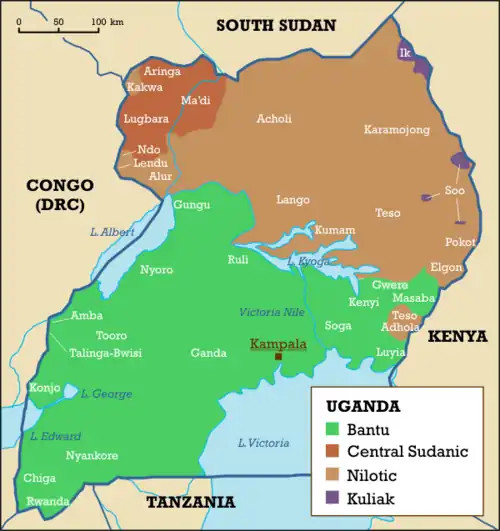 L'Ouganda a pour langues officielles l'anglais et secondairement le swahili[3], mais de nombreuses autres langues sont parlées sur son territoire. Elles appartiennent aux familles des langues bantoues (dont relève également le swahili), nilotiques, soudaniques centrales et kuliak.