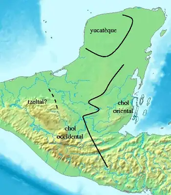 La séparation en zones linguistiques est attestée durant la période classique maya : l'écriture idéophonographique retrouvée dans l'épigraphie (monuments, objets d'art) a permis de trouver des mutations phonétiques et grammaticales dans trois zones : le yucatèque au nord, le chol occidental à l'ouest (ancêtre des chol et chontal) et le chol oriental (ancêtre de chortí et choltí) à l'est, avec une possible quatrième zone tzeltal (ancêtre des tzeltal et tzotzil) à l'extrême ouest[4]. Il semble que la séparation entre les branches est et ouest du groupe chol se soit produite durant la période classique, aux alentours de 650[5].