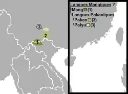 - ↑ Stratification in the peopling of China: how far does the linguistic evidence match genetics and archaeology? In; Sanchez-Mazas, Blench, Ross, Lin & Pejros eds. Human migrations in continental East Asia and Taiwan: genetic, linguistic and archaeological evidence. 2008. Taylor & Francis