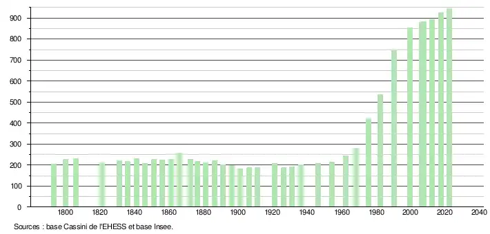 L'évolution du nombre d'habitants est connue à travers les recensements de la population effectués dans la commune depuis 1793. Pour les communes de moins de 10 000 habitants, une enquête de recensement portant sur toute la population est réalisée tous les cinq ans, les populations de référence des années intermédiaires étant quant à elles estimées par interpolation ou extrapolation[13]. Pour la commune, le premier recensement exhaustif entrant dans le cadre du nouveau dispositif a été réalisé en 2007[14].