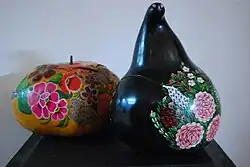 Des objets en bois, en céramique et en onyx sont traités, mais sont loin de l'utilisation des courges séchées[2]. Les gourdes sont longtemps utilisées pour la création de tasses et autres plats, notamment ceux pour la consommation de chocolat par des nobles mésoaméricains[4],[12]. Elles sont également utilisées pour fabriquer des conteneurs de stockage et des objets de décoration[2],[39]. Aujourd'hui, ces jícaras laquées (du Nahuatl xicalli) sont toujours populaires, soit en tant qu'objet de décoration, soit pour créer un bol pour manger ou boire[2].