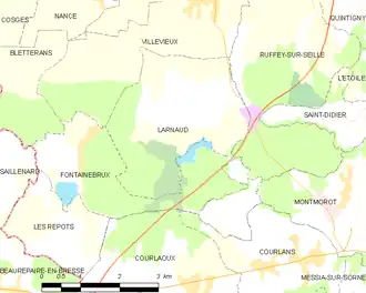 Larnaud est situé entre Lons-le-Saunier et Bletterans et à proximité de l’autoroute A39, dans la plaine bressane. Le territoire est limité par Fontainebrux, Villevieux, Courlans, Ruffey-sur-Seille et Montmorot. Sa superficie est de 1 067 hectares avec 12 étangs et 298 hectares de bois.