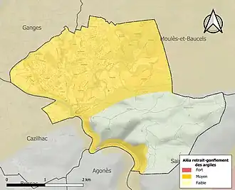 La commune est vulnérable au risque de mouvements de terrains constitué principalement du retrait-gonflement des sols argileux[18]. Cet aléa est susceptible d'engendrer des dommages importants aux bâtiments en cas d’alternance de périodes de sécheresse et de pluie. 64,7 % de la superficie communale est en aléa moyen ou fort (59,3 % au niveau départemental et 48,5 % au niveau national). Sur les 765 bâtiments dénombrés sur la commune en 2019, 765 sont en aléa moyen ou fort, soit 100 %, à comparer aux 85 % au niveau départemental et 54 % au niveau national. Une cartographie de l'exposition du territoire national au retrait gonflement des sols argileux est disponible sur le site du BRGM[19],[Carte 2].