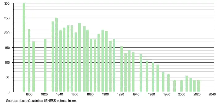 L'évolution du nombre d'habitants est connue à travers les recensements de la population effectués dans la commune depuis 1793. Pour les communes de moins de 10 000 habitants, une enquête de recensement portant sur toute la population est réalisée tous les cinq ans, les populations de référence des années intermédiaires étant quant à elles estimées par interpolation ou extrapolation[30]. Pour la commune, le premier recensement exhaustif entrant dans le cadre du nouveau dispositif a été réalisé en 2006[31].