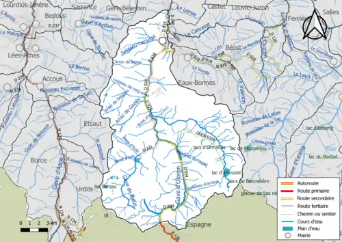 Réseaux hydrographique et routier de Laruns.