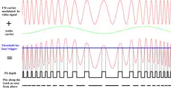 Le schéma ci-joint dévoile une incidence technique complémentaire, notamment due à l'ajout d'un signal audio faisant varier la hauteur de la porteuse modulée en fréquence. Dans ce cas de figure, l'espacement centre à centre des cuvettes, lié à la fréquence, encode la vidéo, et que leur longueur encode l'audio.